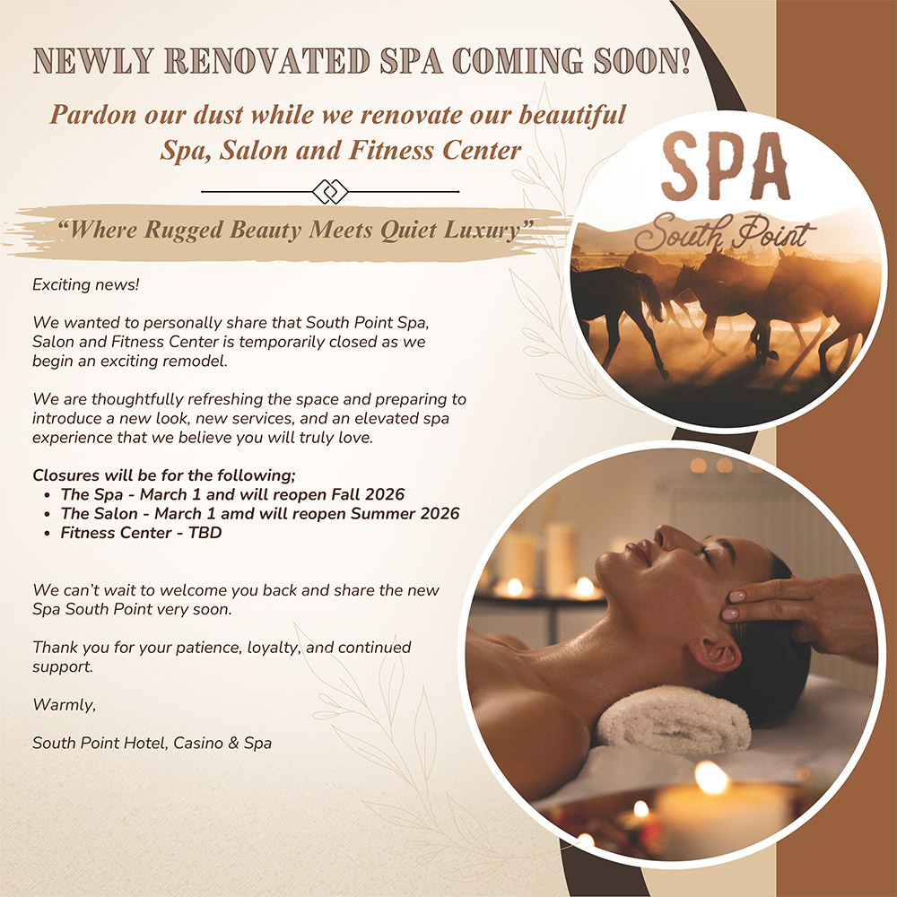 South Point Spa, Salon and Fitness Center is temporarily closed as we begin an exciting remodel. We are thoughtfully refreshing the space and preparing to introduce a new look, new services, and an elevated spa experience.